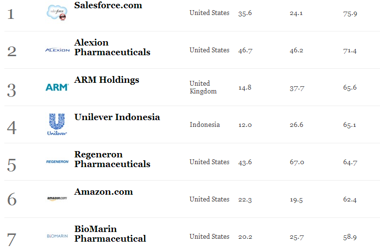 Como ya es toda una tradición, Forbes compiló en conjunto con el equipo de investigación del bestseller The Innovator’s DNA, coescrito por el famoso profesor de la Harvard Business School, Clayton Christensen, un listado con las empresas más innovadoras del año. Las empresas son clasificadas en la lista con base en su prima de innovación, es decir, la diferencia entre su valor de mercado y el valor presente neto de los flujos de efectivo de las empresas existentes.